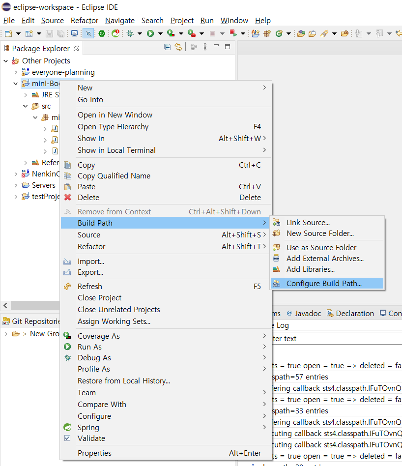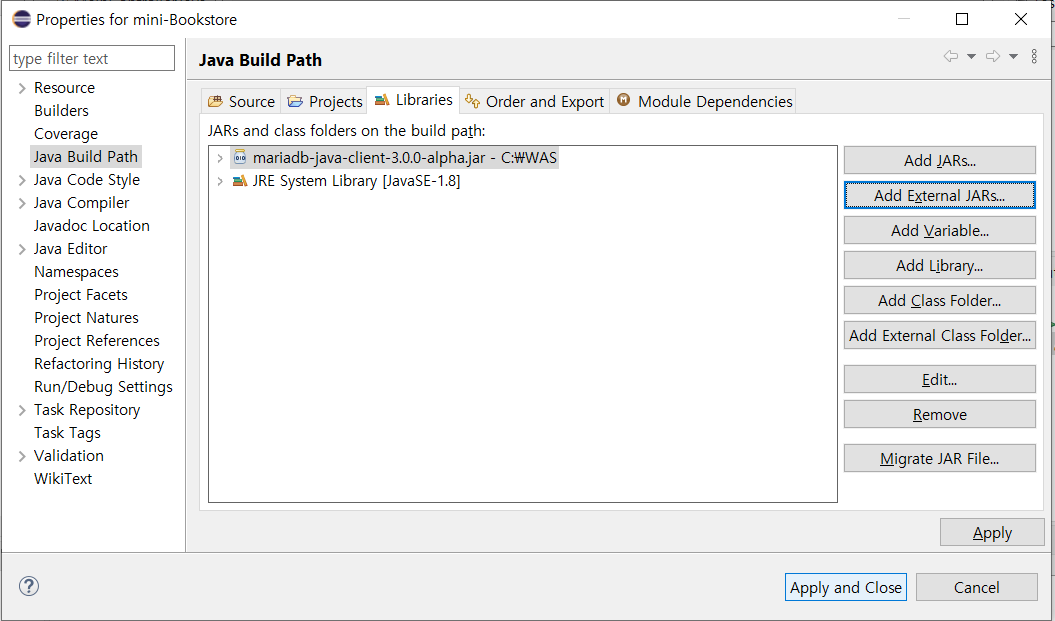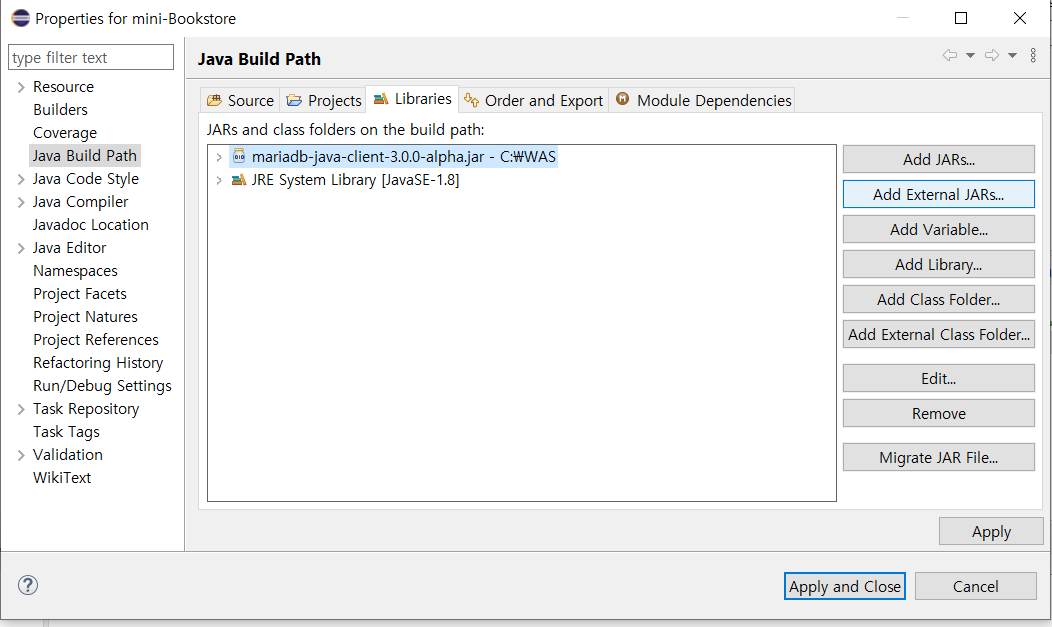 2. 다운로드 받은 jar파일을 빌드 패스 설정 페이지 한다.