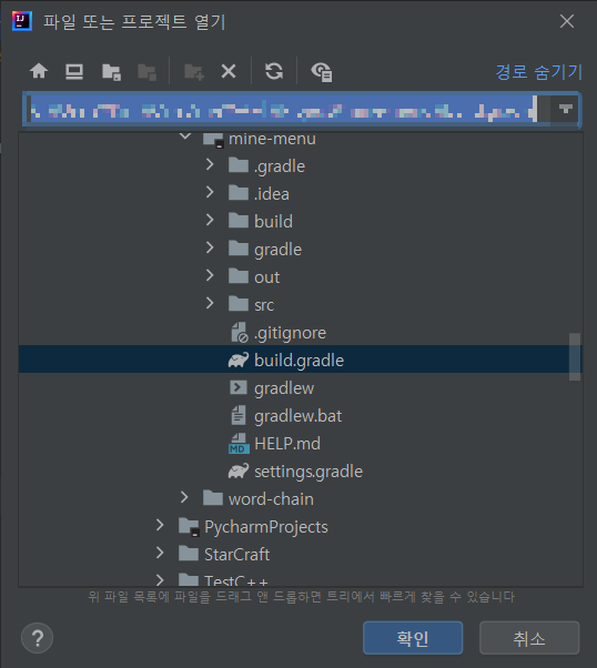 [파일-열기] 혹은 프로젝트 열기를 통해 열고싶은 프로젝트의 build.gladle을 선택 후 [확인]버튼을 누르면 IntelliJ가 알아서 자동으로 빌드를 해준다.