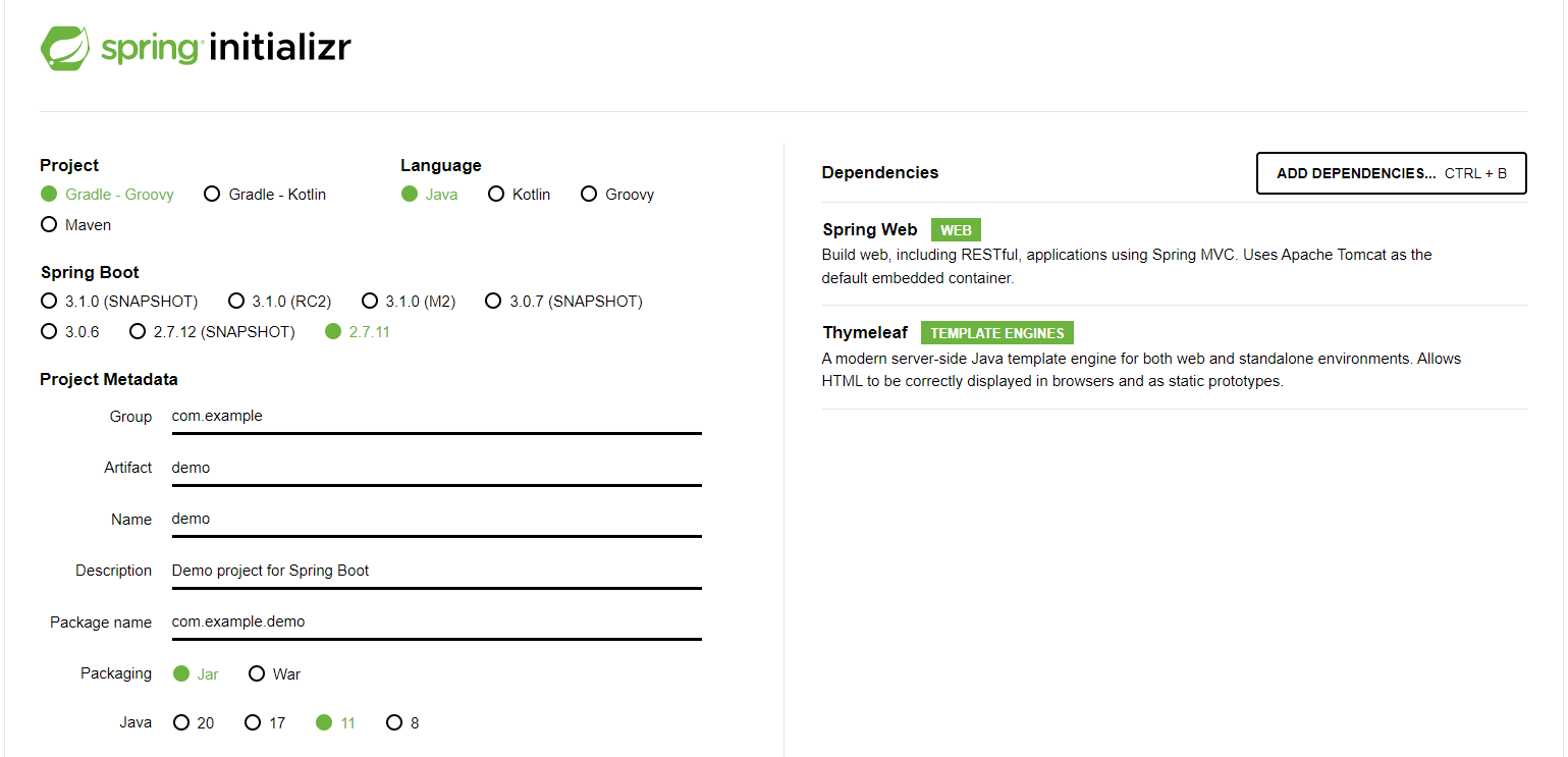 Spring Boot의 경우 아래의 페이지에서 만들 수 있다.
