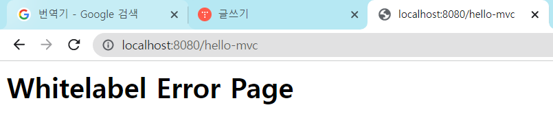 아래와 같은 화면이 뜨며 hello-mvc를 찾을 수 없다는 에러 화면이 나타나게 된다.